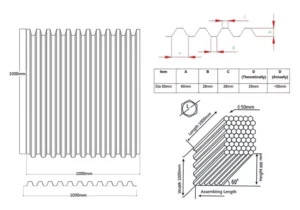 | Spesifikasi | ketebalan mm | Jumlah potongan m2 | berat | m2/KG | Luas permukaan spesifik n2/m3 |